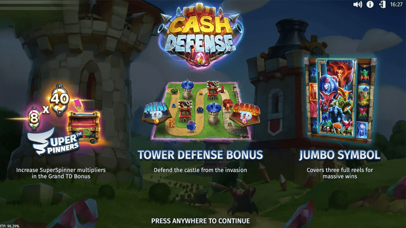 Cash Defense เป็นเดมสล็อตที่ มี 5 รีล และมี 4 แถว มาพร้อมฟีเจอร์ Mini TD และฟีเจอร์ Grand TD Bonus หากสัญลักษณ์ Mini TD ปรากฎในรีลที่ 5 จะเข้าสู่ฟีเจอร์ Mini TD เกมจะมีหอคอยให้คุณ 2 หอคอย สัญลักษณ์ 10 สัญลักษณ์ และศัตรูโบนัส 1 ตัว คุณต้องกำจัดศัตรู เพื่อรับโบนัสจากฟีเจอร์นี้ไป คุณจะเข้า ฟีเจอร์ Grand TD Bonus ของเกม Cash Defense สัญลักษณ์ Bonus ปรากฎบนกระดาน 3 สัญลักษณ์ ในฟีเจอร์ Grand TD Bonus คุณจะมีหอคอย ไว้กำจัดศัตรู และศัตรูจะมา 2 รอบ รอบแรกจะมีศัตรู 10 สัญลักษณ์ ต้องกำจัดอย่างน้อย 5 สัญลักษณ์ เพื่อเปิดใช้งานรอบที่ 2 และรอบที่ 2 จะมีศัตรูทั้งหมด 50 สัญลักษณ์