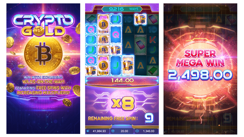 Crypto Gold คริปโตโกลด์ เป็นวิดีโอสล็อตที่มี 6 รีลและมี 6 แถว มีฟีเจอร์ Wilds-on-the-Way และฟีเจอร์ Free Spins ที่มาพร้อมกับตัวคูณที่เพิ่มขึ้น หาก สัญลักษณ์ Free Spins ปรากฎบนกระดาน 4 สัญลักษณ์ จะทำให้คุณเช้าสู่ฟีเจอร์ Free Spins และได้รับสปินฟรี 10 ครั้ง และคุณสามารถได้รับสปินฟรีเพิ่มอีก 2 ครั้ง ต่อ 1 สัญลักษณ์ Free Spins ที่ปรากฎขึ้นมาเพิ่มเติม ตอนเริ่มต้น ฟีเจอร์ Free Spins คุณจะได้รับตัวคูณเริ่มต้นที่ x1 และระหว่างที่อยู่ในฟีเจอร์ หากมีการชนะเกิดขึ้น จะทำให้ตัวคูณเพิ่มขึ้นอีก 1 เกมนี้มีค่าผันผวนตัวเกมระดับสูง โอกาสชนะสูงด้วยค่า RTP ถึง 96.71% และรางวัลโบนัสสูงสุดกว่า 100,000 เท่า