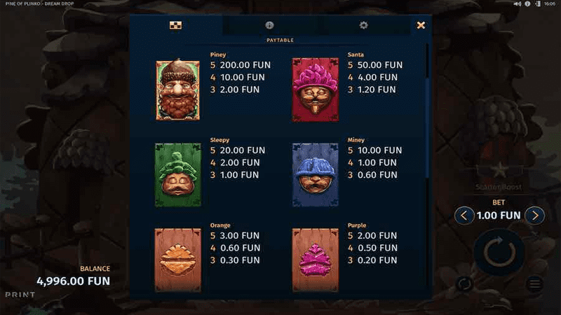 Pine of Plinko Dream Drop เป็นสล็อต 5 รีลพร้อมช่องจ่ายเงินคงที่ 10 ช่อง การสร้างชุดค่าผสมที่ชนะต้องใช้ สัญลักษณ์เดียวกัน 3 ตัวขึ้นไปเพื่อลงจากซ้ายไปขวา โดยเริ่มจากวงล้อซ้ายสุด เดิมพันขั้นต่ำที่นี่คือ0.20 ยูโรต่อการหมุนและเดิมพันสูงสุดคือ100 ยูโรต่อการหมุนพร้อมตัวเลือกอื่นๆ มากมายระหว่างทั้งสอง Pine of Plinko มีด้วยกัน 2 เวอร์ชัน เวอร์ชันหนึ่งมีและไม่มีกลไก Dream Drop RTP ตามทฤษฎีสำหรับ Pine of Plinko Dream Drop คือ93.48% และเวอร์ชันที่ไม่ใช่ Dream Drop คือ96.94 % การชนะสูงสุดถูกจำกัดไว้ที่10,000xสำหรับทั้งสองเวอร์ชัน ในแง่ของสัญลักษณ์ สัญลักษณ์ปกติที่จ่ายสูงสุดที่นี่คือ Piney ตามด้วย Santa (สีแดง), Sleepy (สีเขียว) และ Miney (สีน้ำเงิน ) สัญลักษณ์ที่จ่ายต่ำตกเป็นสัญลักษณ์รูปสีส้ม สีม่วง และสีเขียว